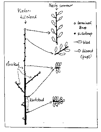 Bilag 1-1. Skud- og knopudvikling (æble). En knop kan være en bladknop (udvikler nyt skud), blomsterknop eller sovende øje (udvikles ikke under normale forhold).