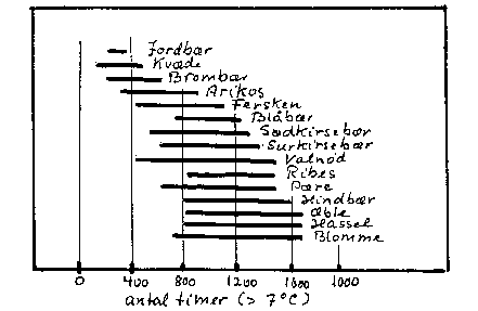 Bilag 1-3. Kuldepåvirkningsbehov (antal timer < 7°C) hos forskellige frugtarter. Efter Westwood (1979).