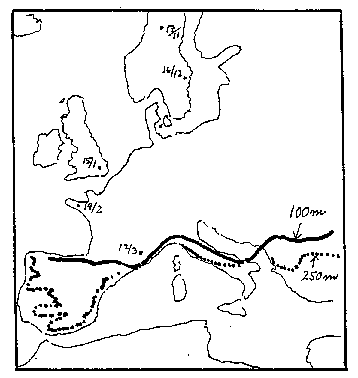 Bilag 1-4. Linjer for 1.000 timer under 7° C ved 100 m og 250 m over havet samt datoer, hvor 1.000 timer < 7°C er nået på forskellige lokaliteter. Efter Kronenberg (1979).