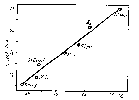 Bilag 1-5. Sammenhæng mellem gennemsnitstemperaturer juli og august og antal dage ved 18°C nødvendig for at få knopbrydning i december. Efter Måge (1975).
