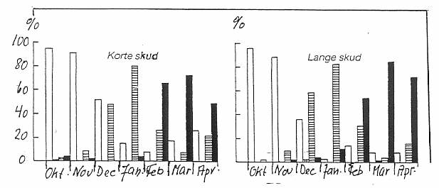 Bilag 2-18. Ændring af sunde (åbne søjle) til brune (skraverede) og døde (sorte) blomsteranlæg fra efterår til forår hos 'Stevnsbær'. Efter Mortensen et al. (1987).