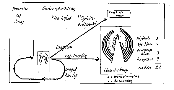 Nodieudvikling i knoppen. Engelske undersøgelser i 60'erne og 70'erne har vist, at en knop skal gennemgå en vis udvikling, inden initiering kan ske. I bilag 2-1 er vist, at en knop egentlig er et sammentrængt skud, hvor der ved aksens nodier (forgreninger) er udviklet omdannede blade; det være sig knopskæl, overgangsblade og højblade foruden anlæg til egentlige blade. Det ser ud til, at der skal dannes et vist kritisk antal nodier i en knop, før der kan initieres blomster. Fx ser dette kritiske nodieantal ud til at være 20 i æblesorten 'Cox's Orange'. Hvis der i løbet af sommeren dannes færre end 20 nodier inde i knoppen, får vi kun dannet bladanlæg, vi får en vegetativ knop. Men hvis det samlede nodieantal når på 20 eller mere, vil vi få en blomsterknop, hvor der anlægges et blomsteranlæg i enden af knoppens akse, og det samme gør der i hjørnerne af højbladene og evt. de øverste egentlige blade (oftest seks til syv blomsteranlæg ialt).