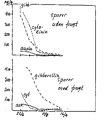 Bilag 2-2. Vækststofsammensætning i sporer uden frugter ( som kan forventes at danne blomsterknopper) og i sporer med frugter (hvor der ingen blomsterknopdannelse sker). Efter Grochowska et al. (1984).
