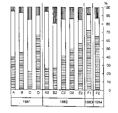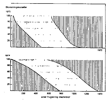 Bilag 2-17. Fordeling af bladknopper (lodrette streger), døde (åben søjledel), og levende (vandrette streger) blomsterknopper i april hos 'Stevnsbær' i forskellige marker og år. Efter Mortensen et al. (1987).