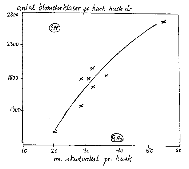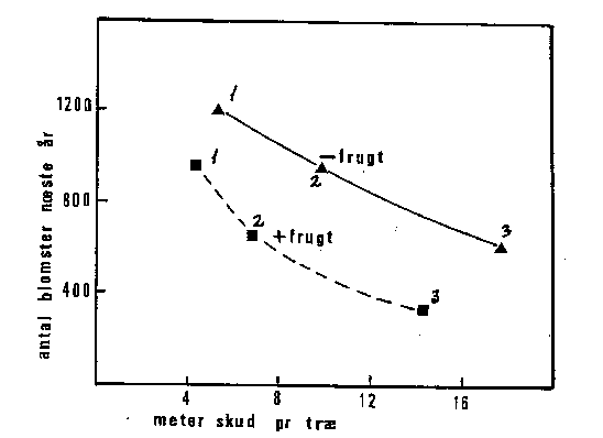 Bilag 2-5. Sammenhæng mellem skudvækstaktivitet og antallet af blomster pr. træ næste år. Æble. 1 = SADH-tilførsel; 2 = ubehandlet; 3 = gibberellintilførsel. Efter Hansen & Grauslund (1980).