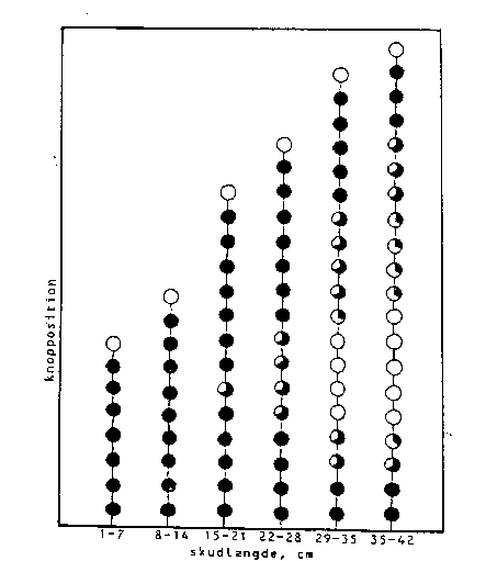 Genvækst i knopper. Som nævnt under "Knopudvikling" (afsnit 1.4) kan kraftige indgreb i træet i den første del af vækstsæsonen få knopperne til at løbe løbsk. De vokser eller bryder igen samme år (bilag 2-1). Der skal så senere udvikles en ny knop, så måske når den nye knop ikke at udvikle det kritiske nodieantal. Ved knibning af skudspidser i sommerens løb brød de allerede dannede knopper. Blomsterknopdannelsen blev reduceret fra 64 til 5 blomsterklaser pr. træ.