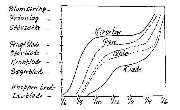 Derfor er der også stor forskel på de gennemsnitlige blomstringstidspunkter for fx æble i Europa (bilag 2-23). Blomstringstidspunkterne varierer derfor også meget med årene afhængigt af temperaturforløbet; der er størst variation hos de tidligst blomstrende arter.