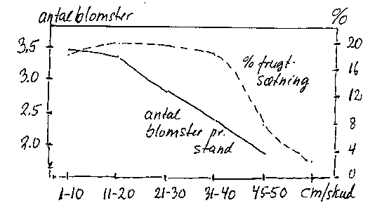 Bilag 2-16. Sammenhæng mellem skudlængde og antallet af blomster pr. blomsterstand (nær skudspids), henholdsvis frugtsætningen (pct. af blomsterantal, gennemsnit af hele skuddet). 'Stevnsbær'. Efter Rasmussen et al. (1983).