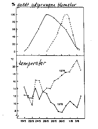 Selve blomstringsforløbet er også styret af især temperaturen; er det varmt, varer den måske kun en uge, mens der i kølige år kan gå mere end 2 uger (bilag 2-24). .