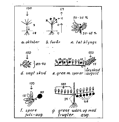 Bilag 5-2. Nogle eksempler på assimilatfordeling i æbletræer. Efter Hansen (1975).