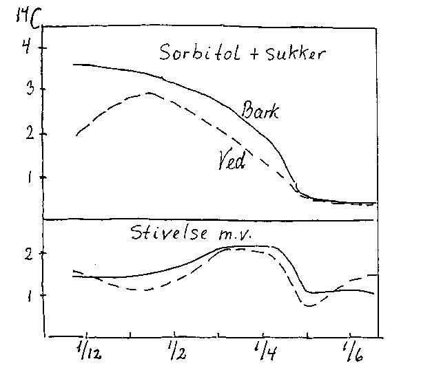 Bilag 5-4. Sæsonmæssige ændringer i forskellige fraktioner af oplagsnæring i æblegrene, udtrykt som 14C-fraktioner, efter 14CO2-tilførsel efterår. Efter Hansen (1975).
