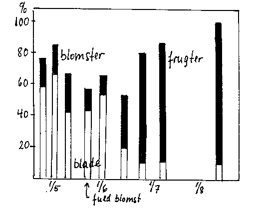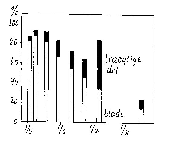 Bilag 5-6. Assimilatfordeling i årsskud i pct. af årsskudbladenes assimilatproduktion på forskellige tidspunkter. Vist ved hjælp af 14C. Efter Hansen (1975).