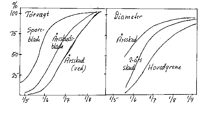 Ser vi på den tidsmæssige tørstoftilvækst i et bestemt organ, får vi ofte en S-formet kurve (bilag 5-8). Sporeblade har allerede afsluttet deres vækst i juni. Dernæst følger med tidsmæssig forskydning årsskudsblade, årsskud, mindre grene, hovedgrene og stamme, og endelig rødder, som ofte har deres hovedtilvækstperiode i september-oktober. Der er variationer mellem arterne; dette gælder også for frugttilvæksten (se afsnit 7.1).