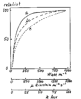 Bilag 13-1. Relativ fotosyntesehastighed som funktion af lysintensitet for a) et enkelt æbleblad, b) en samling blade og c) et helt æbletræ. Efter Lakso & Seeley (1978).