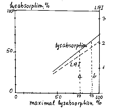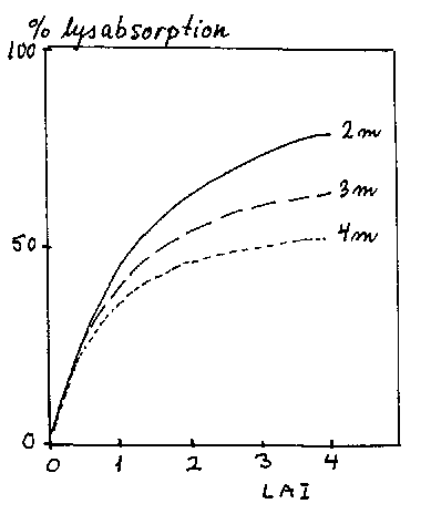 Lysabsorptionen stiger med LAI, og ved uendeligt store LAI (= helt tætte træer - træerne kan opfattes som sorte blokke) vil man nå en teoretisk maksimumværdi (= Fmax), som udtrykker plantagens lysabsorptionspotentiale som funktion af andre forhold end LAI (bilag 13-3).