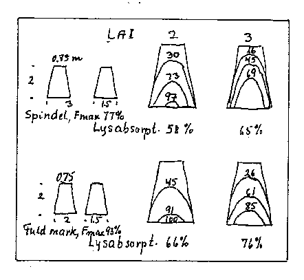 Vi skal altså søge at arrangere løvet på den mest hensigtsmæssige måde, og her spiller LAI = LøvArealIndex og løvstrukturen en rolle (LAI = 1 svarer til 10.000 m² samlet bladareal (ensidigt målt) pr. ha).