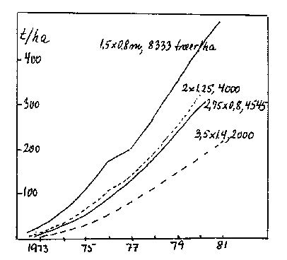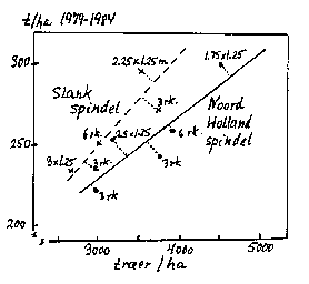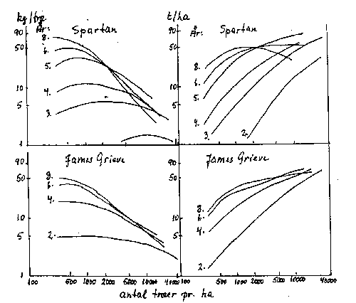 Bilag 13-14. Samlet hektarudbytte (1979-84) ved forskellige træantal, bedsystemer og beskæringssystemer. Efter Wertheim & Wagenmakers (1984).