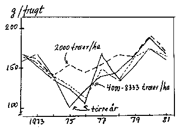 Bilag 13-13. Virkning af træantal/ha på frugtudvikling hos 'McIntosh' (Amen et al. 1983).