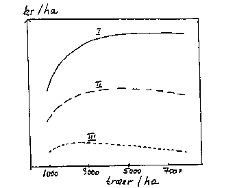 Bilag 13-16. Dækningsbidrag som funktion af træantal/ha ved gunstige (I) og mindre gunstige betingelser for tætplantning (se tekst). Efter Langer (1984).