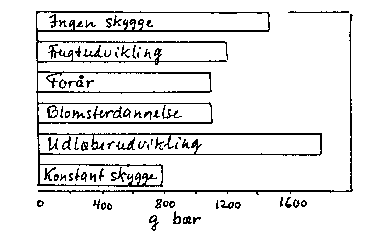Lys har ikke blot betydning for totalproduktionen af tørstof, men også for forløbet af forskellige processer. Dette fremgår af de foregående kapitler, og skyggeforsøg udført af Jackson, East Malling viser det samme (bilag 13-2):