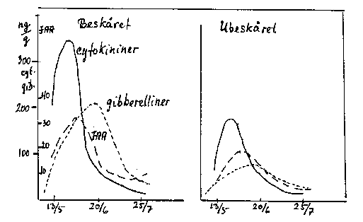 Bilag 14-3. Virkning af kraftig vinterbeskæring på vækststofindholdet i stamme + grene af æble den følgende vækstsæson. Efter Grochowska et al. (1984).