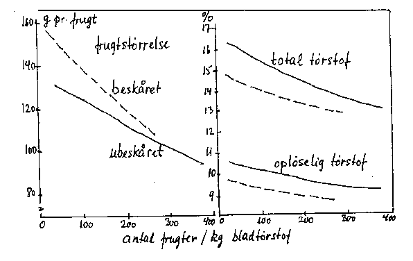 Blad/frugt-forholdet vil derved øges, og den relative forøgelse af årsskuddenes længde og dermed bladmængden på årsskud vil virke i samme retning. Det øgede blad/frugt-forhold vil også være med til at øge frugtstørrelsen og påvirke kvaliteten.