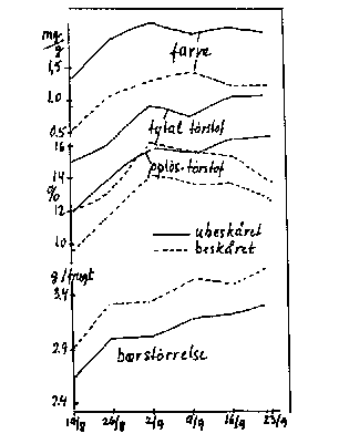 Også hos solbær (bilagene 6-19, 6-20) giver den øgede sink-aktivitet efter beskæring større frugter med et lavere tørstof- og farveindhold. Derimod synes syreindholdet øget, så at sukker/syre-forholdet altså mindskes ved beskæring (bærrene bliver lidt surere).