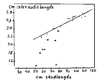 Bilag 15-2. Relation mellem internodie- og skudlængde ved normal (.....) og kompakttyper (X). Efter Poll (1974).