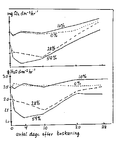 Bilag 15-5. Virkning af rodbeskæring (pct. rødder fjernet) på fotosyntese- og transpirationsintensitet i æble. Efter Geisler & Ferree (1984).