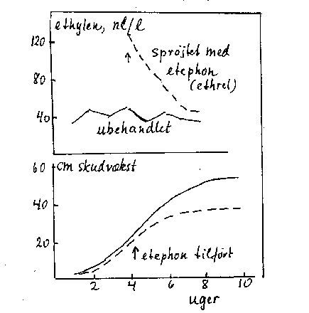 Bilag 16-4. Virkning af etephon-sprøjtning på ethylenindhold og vækst af æbleskud. Efter Walsh & Kender (1980).
