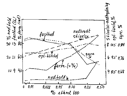 Bilag 16-5. Virkning af ethrel på frugtudviklingen hos æble. 'Summerred' sprøjtet den 22. august, målt den 2. september (fasthed 18. september). Nedfald modvirket ved sprøjtning med NAA. Efter Grauslund (1976).