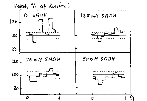 Bilag 16-6. Virkning af SADH på auxin-indhold i æbleskudspidser. Vist ved Avena-internodie-væksttest efter tyndtlagskromatografi. Efter Jindal & Dalbro (1977).