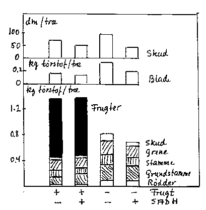 Bilag 16-9. Virkning af SADH på tilvækst i forskellige dele af bærende og ikke-bærende æbletræer (Hansen & Grauslund 1978).