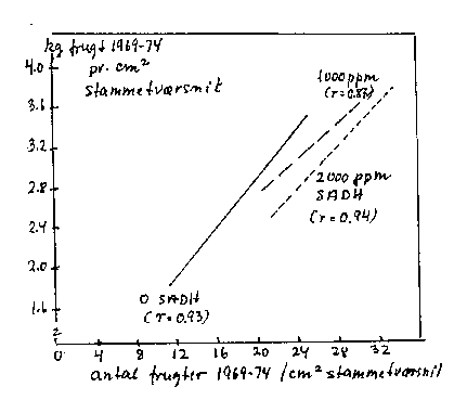 Bilag 16-11. Virkning af SADH på sammenhæng mellem udbytte og frugtantal på stammetværsnit-basis i æble (Grauslund 1976).