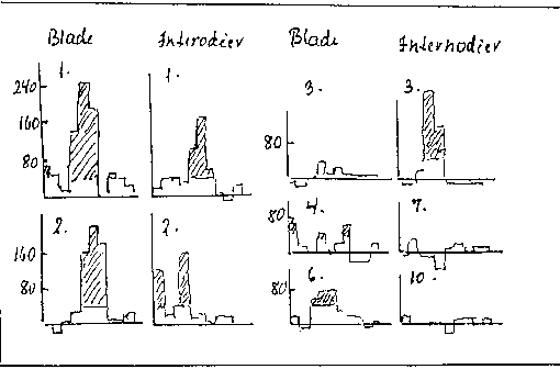 Bilag 16-2. Gibberellinindhold (skraveret) i blade og internodier regnet fra spidsen af æbleskud. Diffusater adskilt ved tyndtlagskromatografi og analyseret med Rumex-biotest. Efter Grauslund (1972).