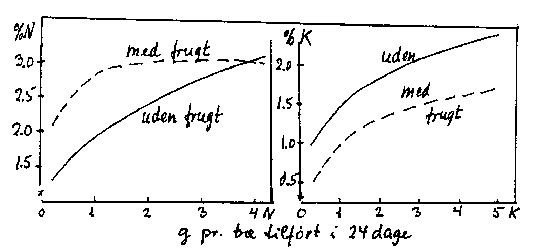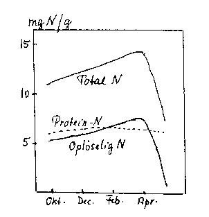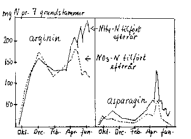 Hovedparten af det optagne kvælstof synes her at oplagres i opløselig form (bilag 19-4). Asparagin tjener som kvælstofholdigt transportstof, men hovedparten af det opløselige kvælstof oplagres i form af arginin (bilag 19-5), som har et højt N/C-forhold (0,67 mod 0,5 i asparagin).