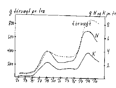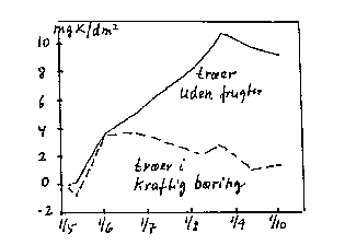 Bilag 19-7. Sæsonmæssig tilvækst og næringsstofoptagelse i hele træet i unge æbletræer. Efter Poulsen & Jensen (1964).