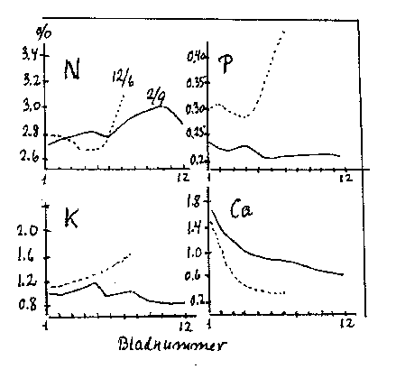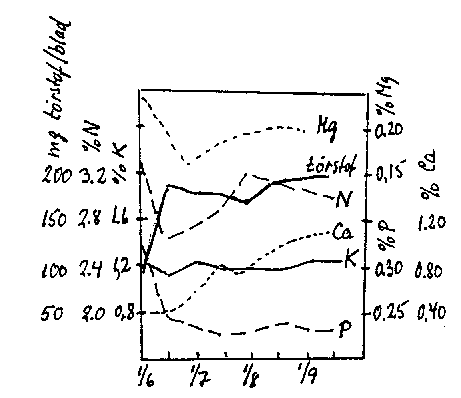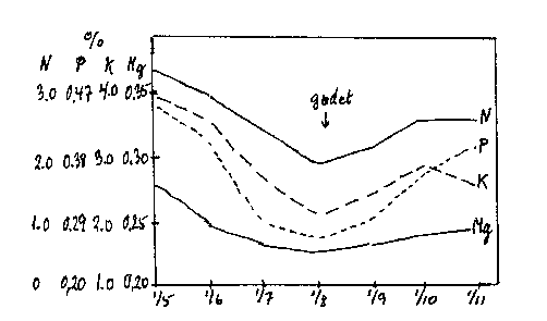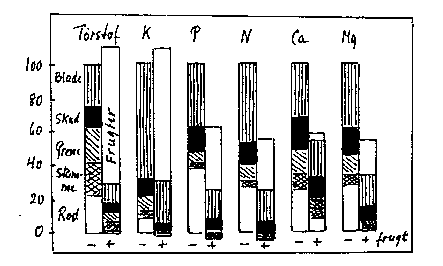De største næringsstofmængder indlejres i bladene. Næringsstofoptagelsen vil derfor være særlig stor i den første halvdel af vækstsæsonen; det er vist i såvel unge æbletræer som i solbærplanter (bilag 19-8). Ser vi som her på totalindholdet af næringsstoffer pr. plante, så vil dette falde igen sensommer og efterår på grund af bladfald (til trods for den indvandring, der sker fra bladene).