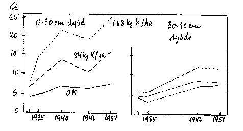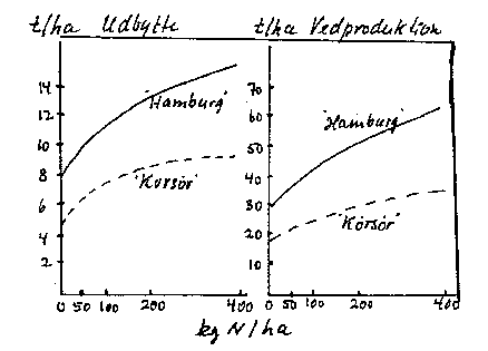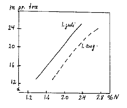 Bilag 19-6. Virkning af kvælstofreserver og tidspunkt for kvælstoftilførsel på skudtilvækst (cm/træ) hos unge æbletræer (Hansen 1968).