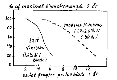 d) Ved egentlig N-mangel, dvs. ved lave N-procenter i bladene sommeren forud, eller når der er lyse blade, bliver blomsterudvikling og frugtsætning nedsat, som omtalt. Her vil der være en god grund til forårssprøjtning med kalisalpeter, urea eller et andet kvælstofholdigt middel, eller endnu bedre er det at sprøjte med urea i perioden op mod løvfald. Her kan der som nævnt tilføres relativt store mængder kvælstof, da der kan bruges store koncentrationer (eksempelvis 4%), fordi bladsvidninger kan tillades på dette tidspunkt.