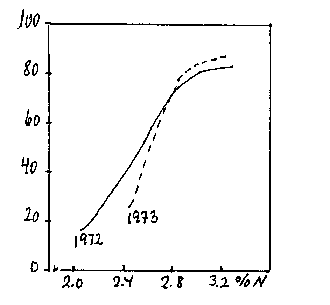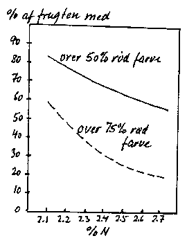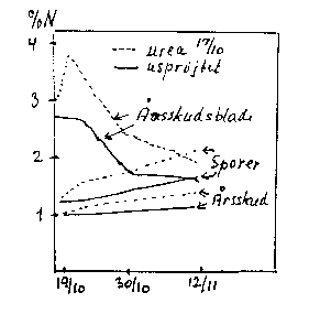 Bilag 19-1. Ændring i kvælstofkoncentrationen efterår med og uden urea-sprøjtning (4%). Æble. Efter Oland 1960.