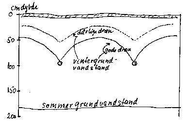 Det er vigtigt at være opmærksom på, at grundvandstanden om sommeren er lavere end drænrørene, mens den om vinteren i området mellem drænledningerne når højere op end drænrørenes dybde. Graden vil afhænge af jordtypen, og forholdet bliver særligt grelt, hvis drænrørene fungerer dårligt (bilag 20-3).