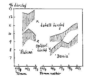 Bilag 20-24. Reduktion i tørstofindhold (skraveret) ved drypvanding af to jordbærsorter af forskellig modningstid. Nedbørsunderskud i juni 104 mm. Pometet.