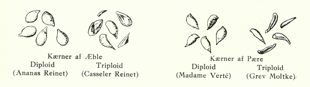 Som for Æble har vi også for Pære det Forhold, at nogle Sorter er diploide med 34 Kromosomer i de vegetative Cellers Kærner, medens der er andre Sorter, som er triploide med 51 og nogle endda tetraploide med 68 Kromosomer. Også for Pære gælder det, at de triploide Sorter danner dårligt Blomsterstøv og kun i ringe Grad er i Stand til at befrugte andre Sorter; selv må de bestøves af diploide Sorter. Pæretræerne kan imidlertid i ret stor Udstrækning danne Frugter uden Befrugtning, et Forhold der kaldes Parthenokarpi. Frugter dannet på denne Måde er uden Kærner og med lille Kærnehus, hvorfor de er tynde og ikke så karakteristisk bugede som normale Frugter. De har ringe Handels- og Brugsværdi, hvorfor Forholdet mest er af teoretisk Interesse.
