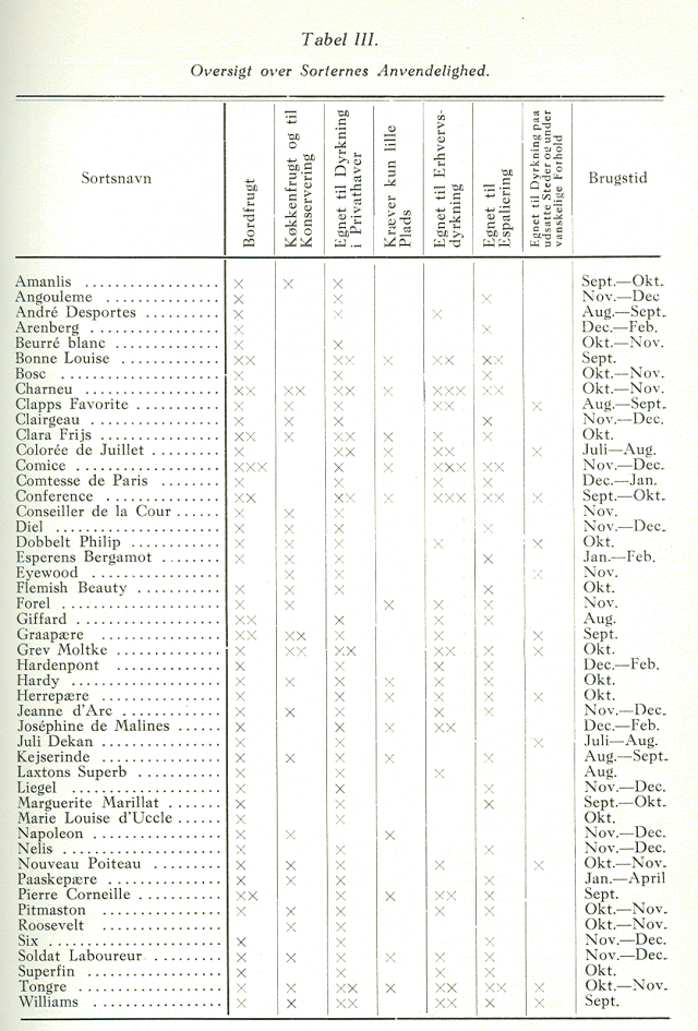 På Tabel III er der givet en Oversigt over Sorternes Anvendelighed. Et x i en Kolonne betyder, at Sorten er anvendelig til det pågældende Formål. Er der flere x'er, skal dette antyde, at Sorten er særlig værdifuld. Det siger sig selv, at denne Klassificering har en skønsmæssig Karakter. Angivelserne i Kolonnen for Brugstid må også tages med Forbehold, da en Sorts Brugstid kan variere meget fra år til år og desuden er afhængig af Plukketiden og Opbevaringen. Navnlig er Angivelserne for de sentmodne Sorter usikre, dels fordi vore Erfaringer her er spinkle og dels fordi Indflydelsen af de ovennævnte Faktorer her især gør sig gældende.