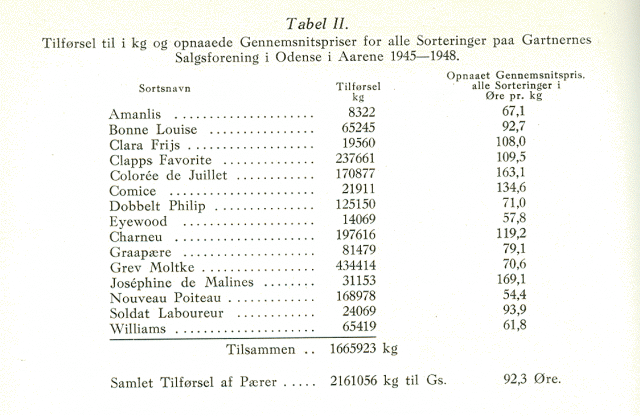 Tabel II giver en Oversigt over den samlede Tilførsel til Gartnernes Salgsforening i Odense for årene 1945—48. Hvad Kilo angår, ligger Grev Moltke klart i Spidsen, derefter kommer Clapps Favorite, Charneu, Nouveau Poiteau, Colorée de Juillet, Dobbelt Philip, Gråpære, Williams, Bonne Louise, Joséphine de Malines, Soldat Laboureur, Comice, Clara Frijs, Eyewood og endelig til sidst Amanlis. — Af denne Tabel fremgår det, at der ved Tællingen i 1939/40 burde have fundet en større Sorts-Udspecialisering Sted. I Kolonnen for Gennemsnitsprisen ligger Colorée de Juillet højest (den store Tidlighed), dernæst Joséphine de Malines (den store Holdbarhed) og som Nr. 3 Comice (den fine Kvalitet). Men får her Fingerpeg om, hvor Vægten bør lægges ved Sortsvalget. Lavest ligger Nouveau Poiteau. Tallene her siger intet om Rentabiliteten, da vi ingen forsøgsmæssige Oplysninger har om de forskellige Sorters Afkastning pr. Arealenhed og heller ikke om Produktions-, Opbevarings- og Salgsudgifter.