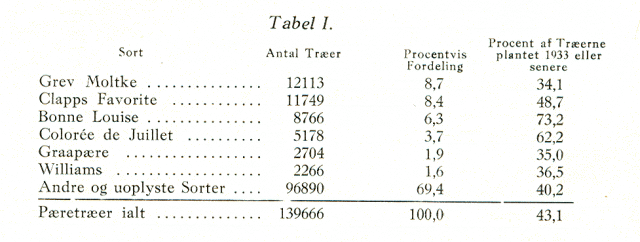 Ved Tællingen i 1939—40 indhentedes der nogle Oplysninger om Pæresorter dyrket i erhvervsmæssige Frugtplantninger. Tabel I fortæller herom: