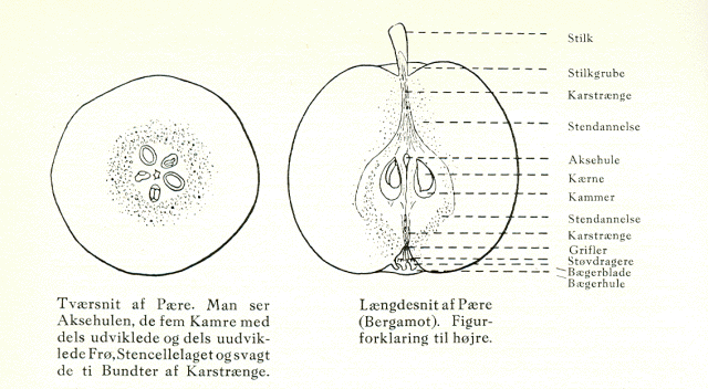 Frugten. Tegningen viser et Længde- og et Tværsnit af en Pærefrugt vedføjet de gængse Betegnelser på Frugtens enkelte Dele.