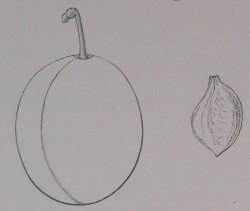 Beskrivelse af Frugten. - Størrelse og Form: middelstor, smuk regelmæssig oval, ca. 34 mm bred, næppe så tyk, 40 mm høj. Furen flad, deler lige, det store, lysebrune Punkt sidder på Spidsen eller ganske lidt til Siden uden Fordybning. -- Stilk: kort, tynd, grøn med brun Rust; Hulen flad, snæver, ubetydelig. -Hud: mørk rødligblå, Solsiden meget mørkere; Punkter meget fine, ses kun under Glasset, tyk, blålig Dug dækker Frugten. -- Kød: grønlig gult, lidt brunligt næst Huden, meget saftfuldt, af god, sød, krydret Smag. Huden er syrlig. — Sten: lille, eliptisk, skæv, nedad skarpt spids, opad løber den ud i en påsat, lige afskåret Forlængelse; Ryggen er bred med flade Kanter, enkeltvis kan Midtkanten dog være lidt skarp, Bugfurer middeldyb, snæver, slipper godt Kødet.