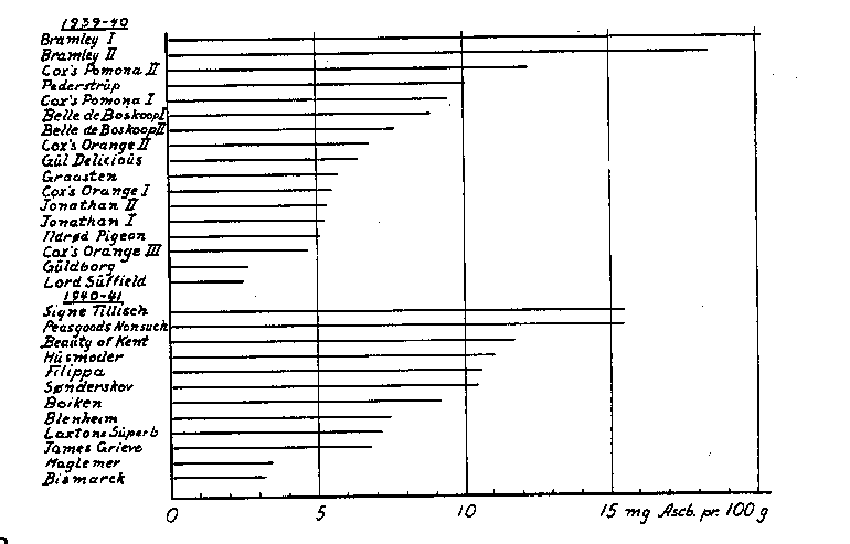 Æblefrugtens ernæringsmæssige Værdi er afhængig af en Række Egenskaber, deriblandt Indholdet af C-Vitamin. For at kaste Lys over dette vigtige Problem har Statens Vitaminlaboratorium arbejdet med Spørgsmålet og om nogle af de fundne Værdier offentliggjort en foreløbig Beretning i »Faglige Meddelelser fra Statens Husholdningsråd«, Oktober 1941. Nedenstående Diagram viser Resultatet af den kemiske Bestemmelse af C-Vitaminet udtrykt i mg Ascorbinsyre pr. 100 g Æble. De benyttede Frugter var af Middelstørrelse og høstede på jævnaldrende Træer. Prøve I er undersøgt straks efter Leveringen, II efter 2—4 Måneders Lagring og III efter 6—8 Måneders Lagring. I andre Forsøg er Vitaminindholdet undersøgt i store og små Æbler, Æbler under forskellig Lagringstemperatur og fra forskelligt gødede Parceller,